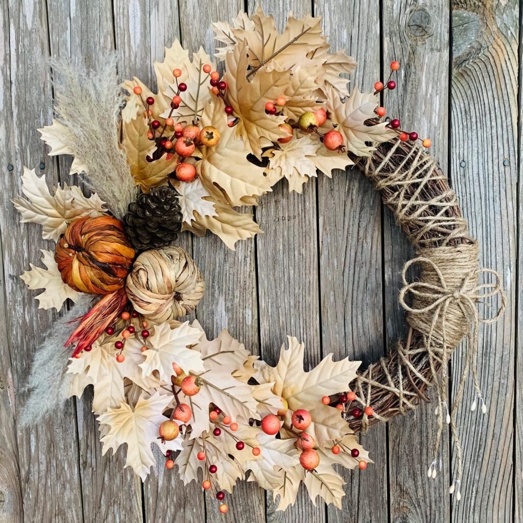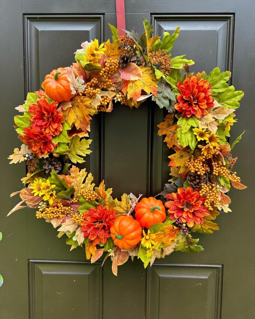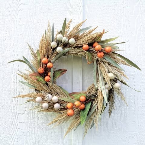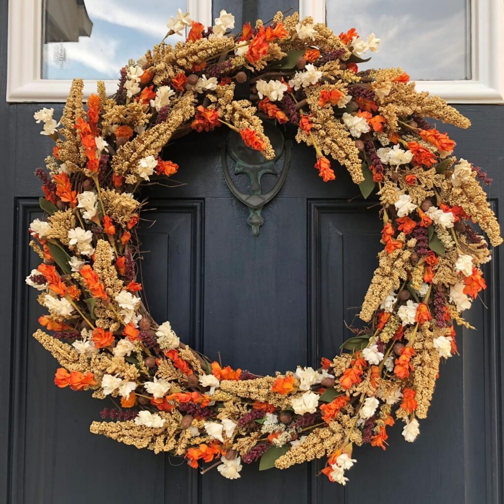 This style suits homeowners who love relaxed, natural decor. The grasses continue moving even indoors, bringing life to your entrance. Consider adding small branches or seed pods you’ve collected during nature walks to make it uniquely yours. This wreath celebrates autumn’s wild beauty without fuss or formality.