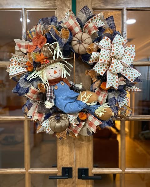 This charming fall front door wreath brings childhood memories to life with its adorable scarecrow centerpiece surrounded by denim-blue mesh ribbon. The scarecrow’s friendly face and straw hat create instant appeal, while his denim overalls tie into the overall color scheme. Fabric pumpkins in autumn tones nestle throughout the blue mesh layers.