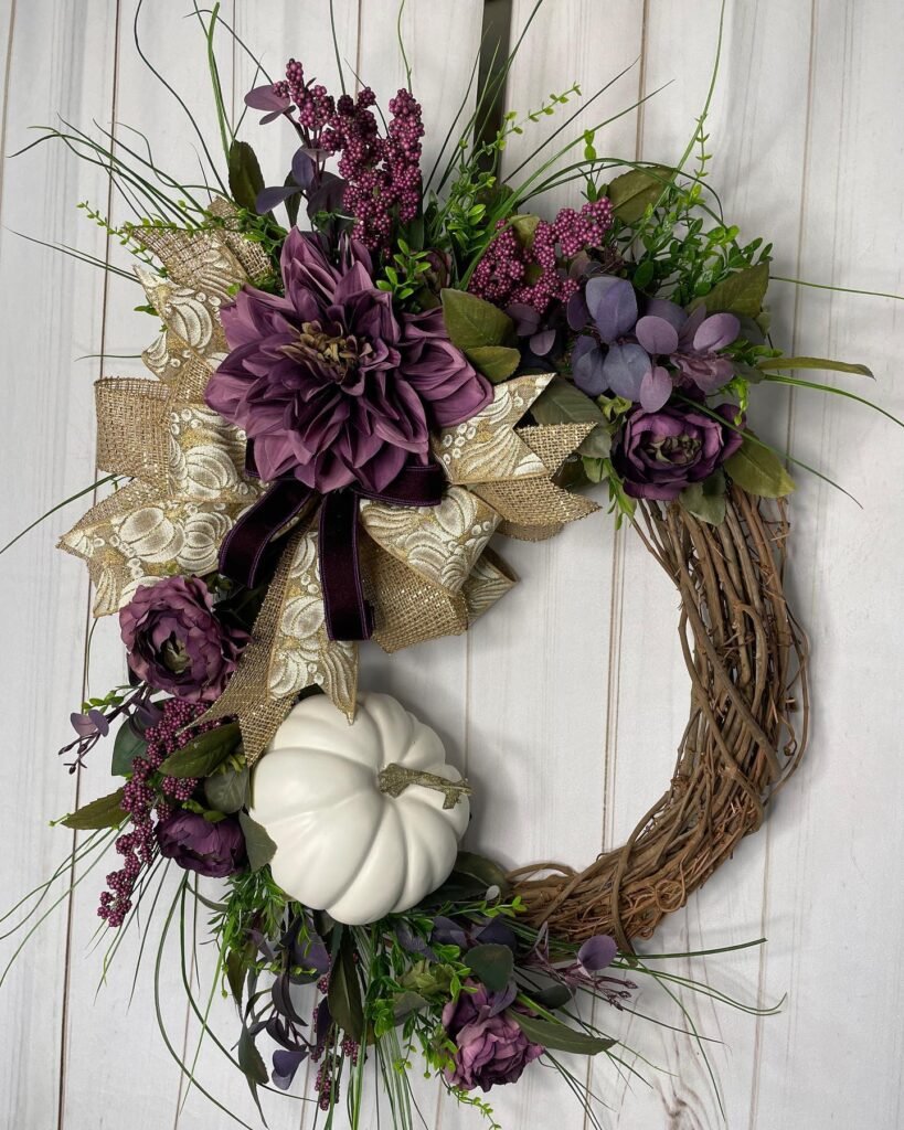 This design works wonderfully for those who prefer subtle autumn colors. The purple and gold combination feels both seasonal and timeless, transitioning beautifully from early fall through Thanksgiving. Position it where morning or evening light can highlight the metallic ribbon’s shimmer for maximum impact.