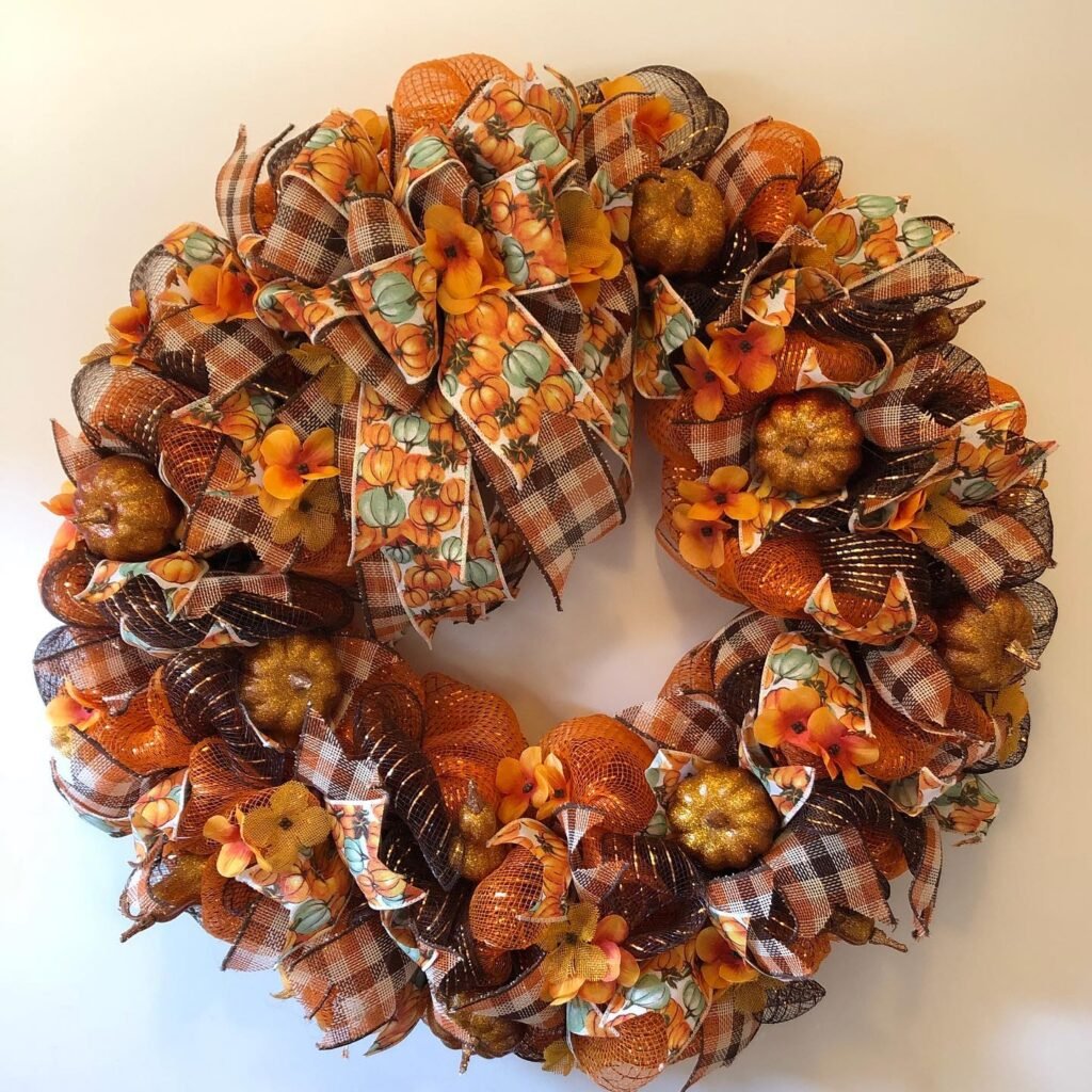 This dazzling fall front door wreath combines traditional autumn elements with contemporary styling through its brilliant use of metallic mesh ribbon. Bronze and copper tones shimmer throughout the design, while pumpkin-patterned ribbons weave between the ruffled mesh layers. Small decorative pumpkins and autumn florals punctuate the flowing fabric, creating delightful surprise elements.
