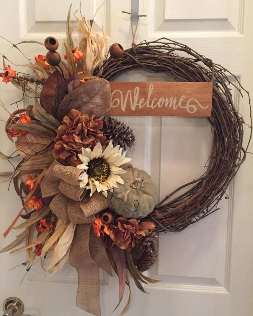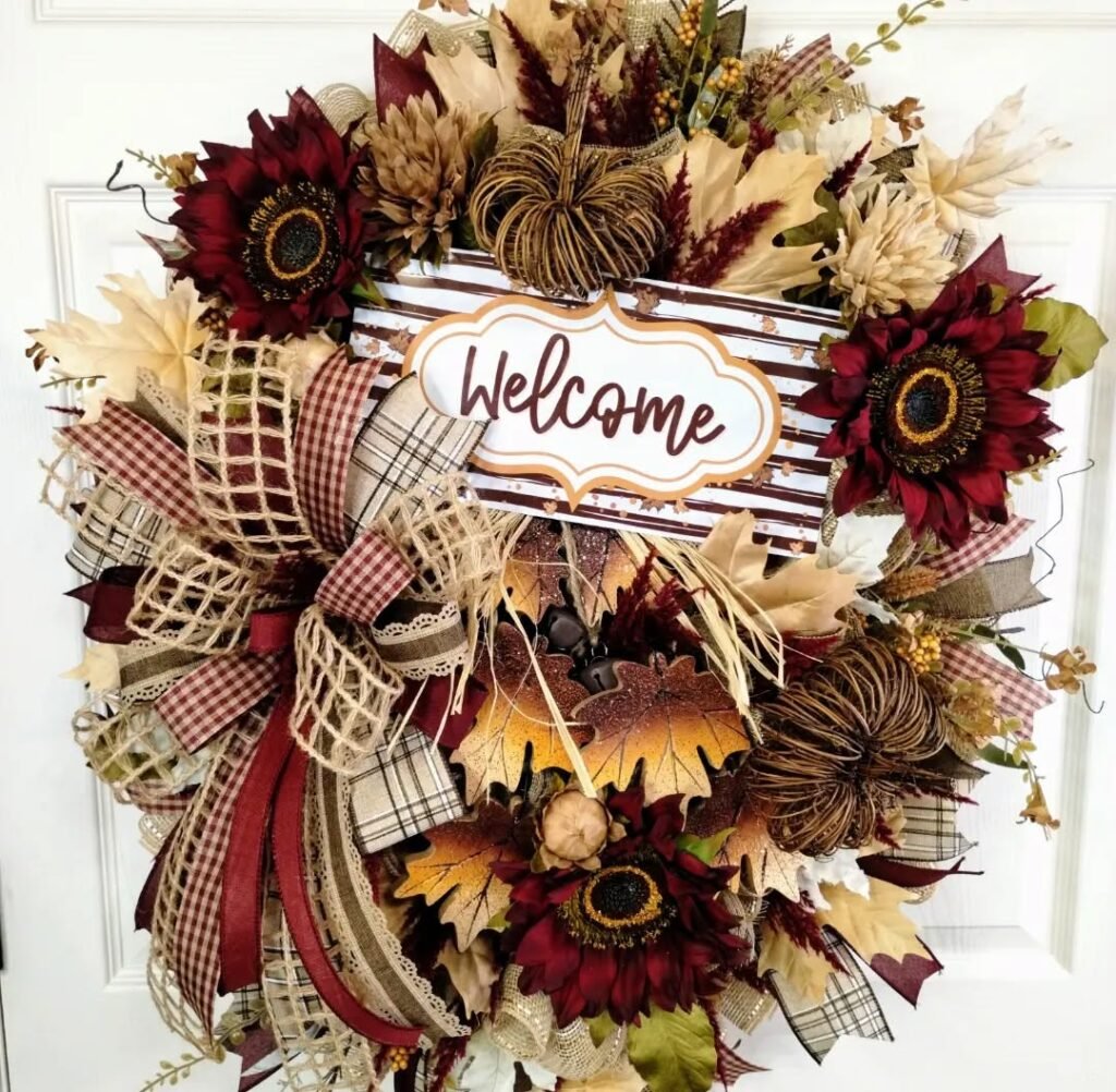 This wreath suits traditional home styles beautifully, especially those with neutral or warm-toned exteriors. The “Welcome” message feels genuine and inviting, setting a tone of hospitality from the moment guests approach your door. The sophisticated color choices make this design suitable for early fall through Thanksgiving, giving you extended seasonal value from one stunning piece.