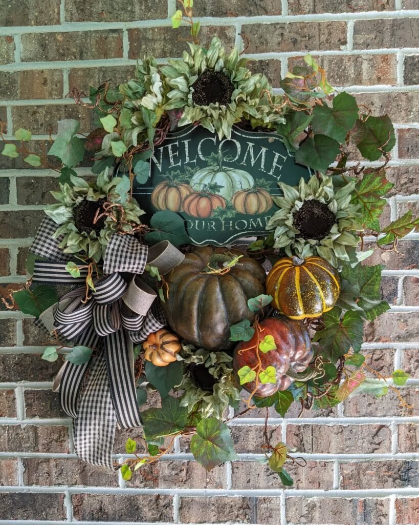 This elegant fall front door wreath elevates seasonal decorating with its sophisticated color palette and artistic arrangement. Multiple pumpkins in varying sizes and finishes create visual rhythm, from deep bronze metallic spheres to warm amber varieties. The “Welcome to Our Home” chalkboard sign adds a personal touch while maintaining the design’s refined aesthetic.