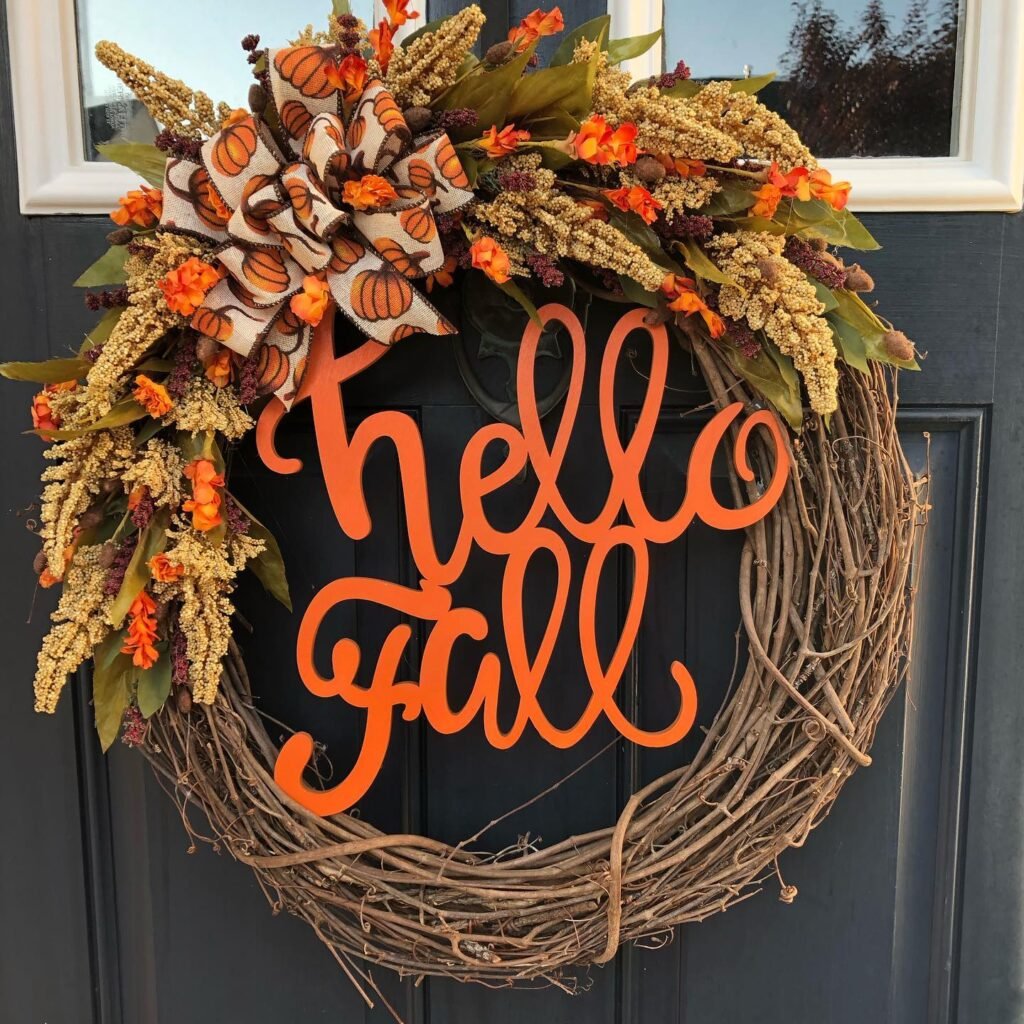 This vibrant fall front door wreath makes a bold statement with its cheerful “Hello Fall” greeting in bright orange script lettering. The grapevine base provides rustic texture while golden millet sprays create dramatic height and movement. Orange florals peek through the arrangement, adding pops of seasonal color that catch the eye from across the street.