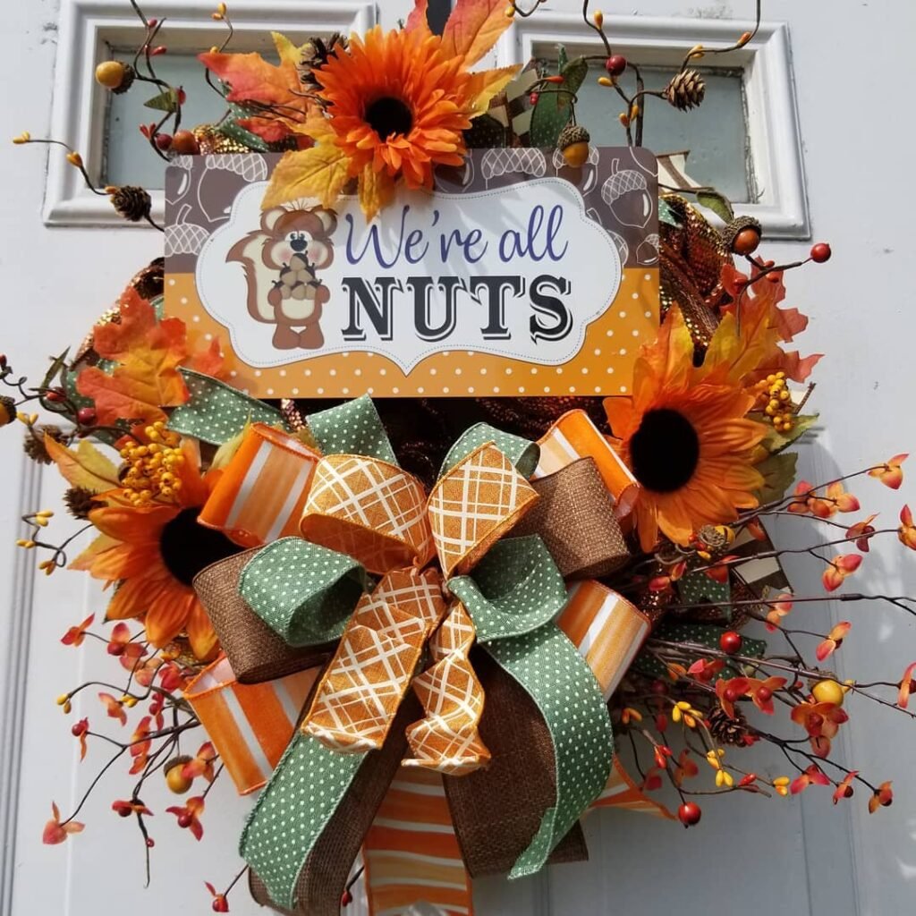 This playful fall front door wreath brings humor to autumn decorating with its clever “We’re All Nuts” message and adorable squirrel graphic. Bright orange sunflowers serve as focal points, their cheerful faces complementing the warm color scheme. The multi-pattern bow combines orange stripes, sage green polka dots, and lattice designs for visual interest.
