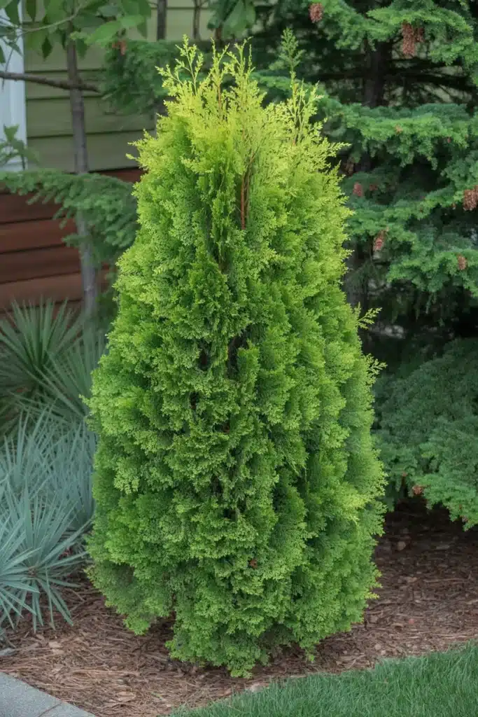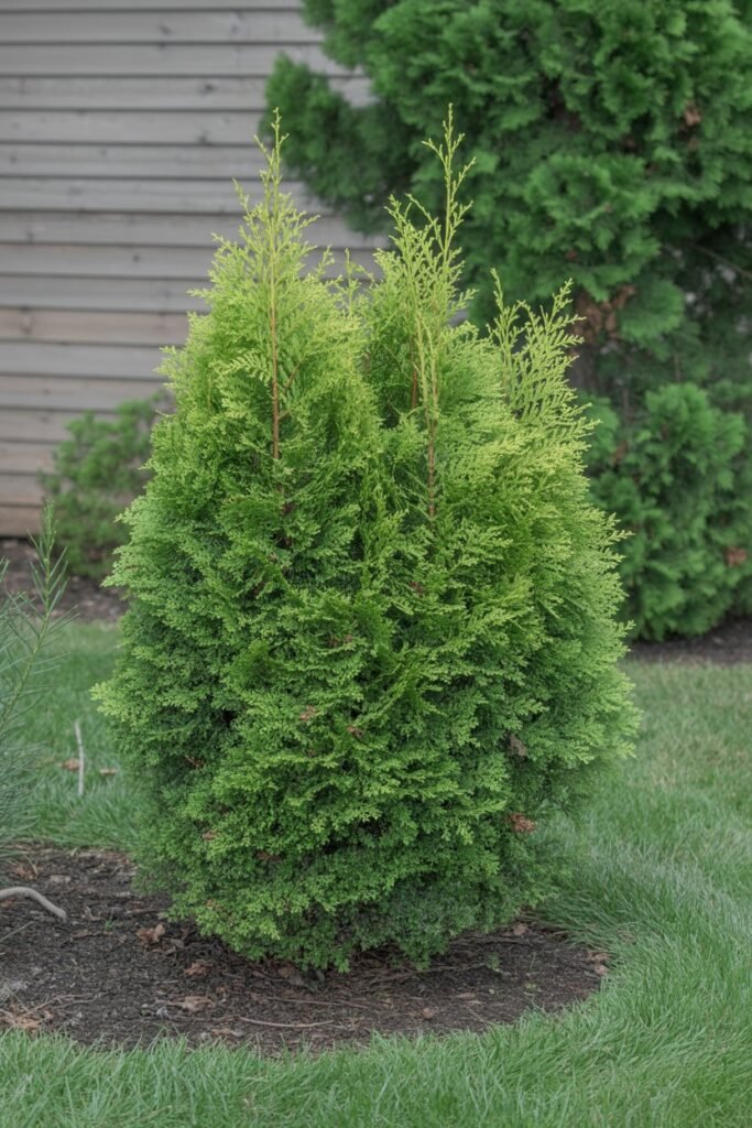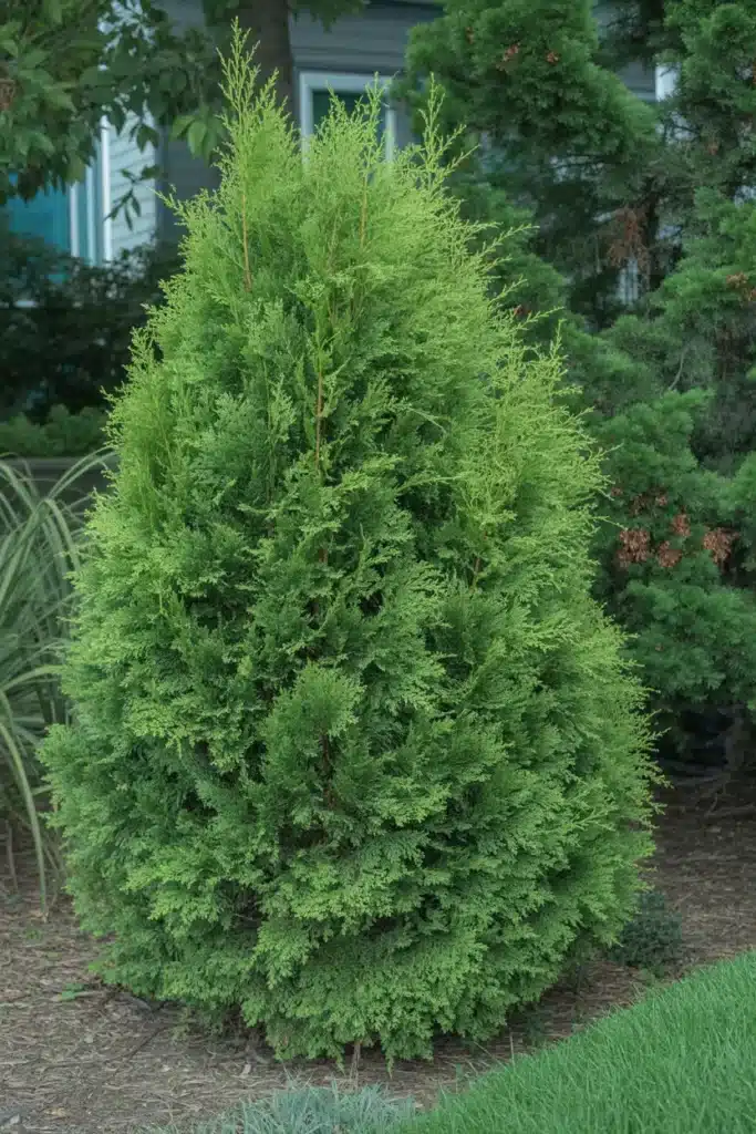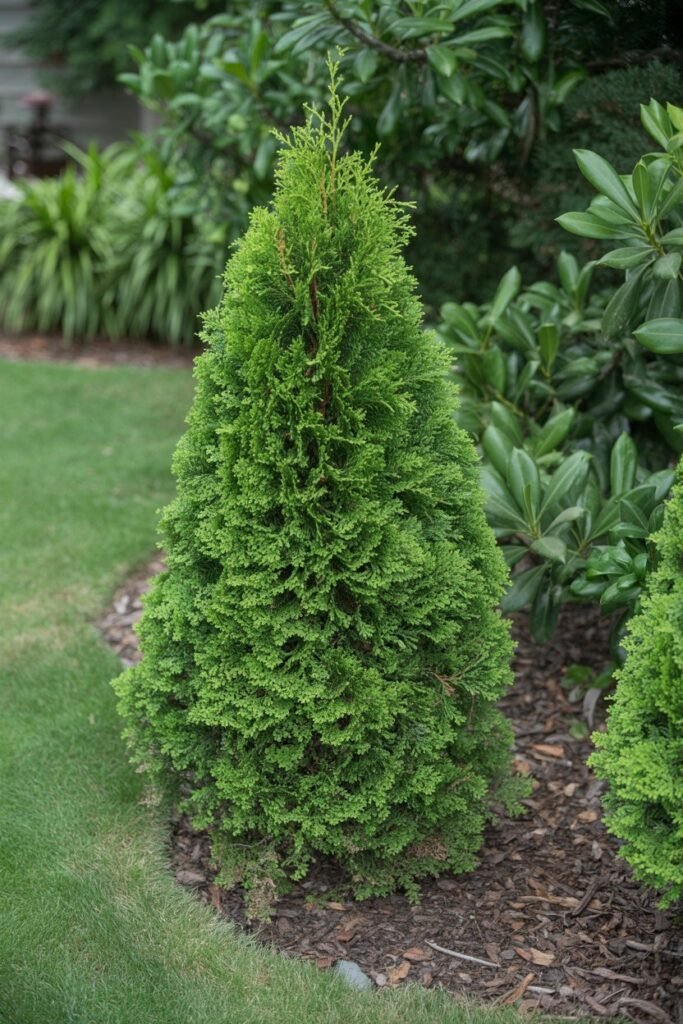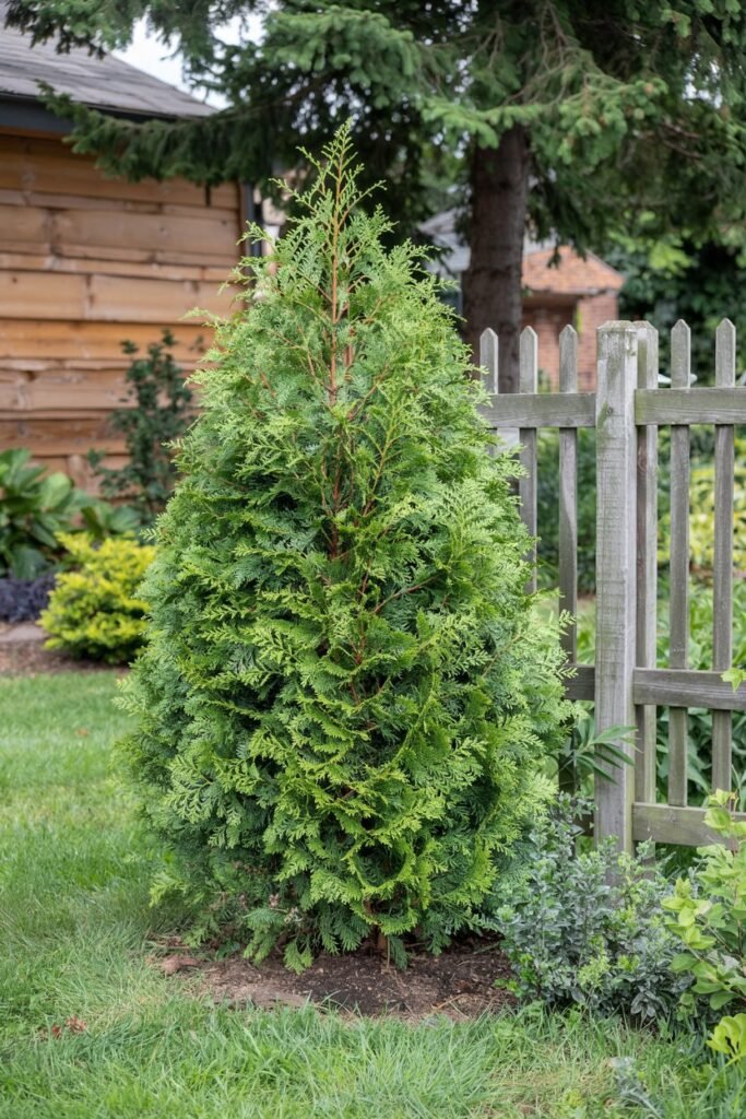 A more compact cousin of the Green Giant, the Emerald Green Arborvitae is perfect for smaller spaces. It grows at a moderate rate of about 1 foot per year and maintains a neat, narrow, pyramidal shape without much pruning.