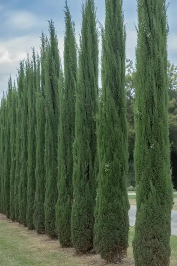 If you’re looking for a formal, elegant privacy screen, I highly recommend the Italian Cypress. These trees have a very narrow, columnar shape that adds a touch of Mediterranean sophistication to any landscape. They grow about 2-3 feet per year.