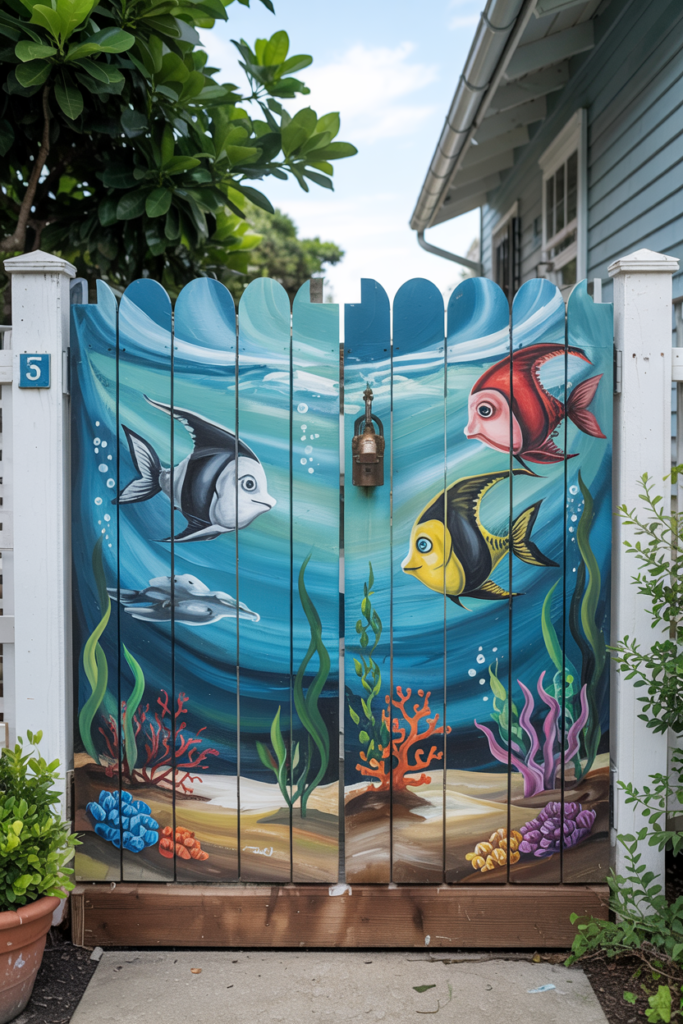 An under the sea theme brings vibrant color and life to any fence. It allows for creative inclusion of marine elements like coral reefs, ocean fish, and underwater plants. This style works well for those who enjoy marine life or want a calming, nature-inspired outdoor space.