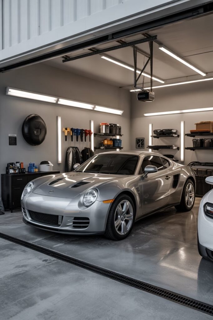 Add LED lighting to enhance the metallic effect. This bold choice transforms your garage into a cutting-edge space for innovation or display.