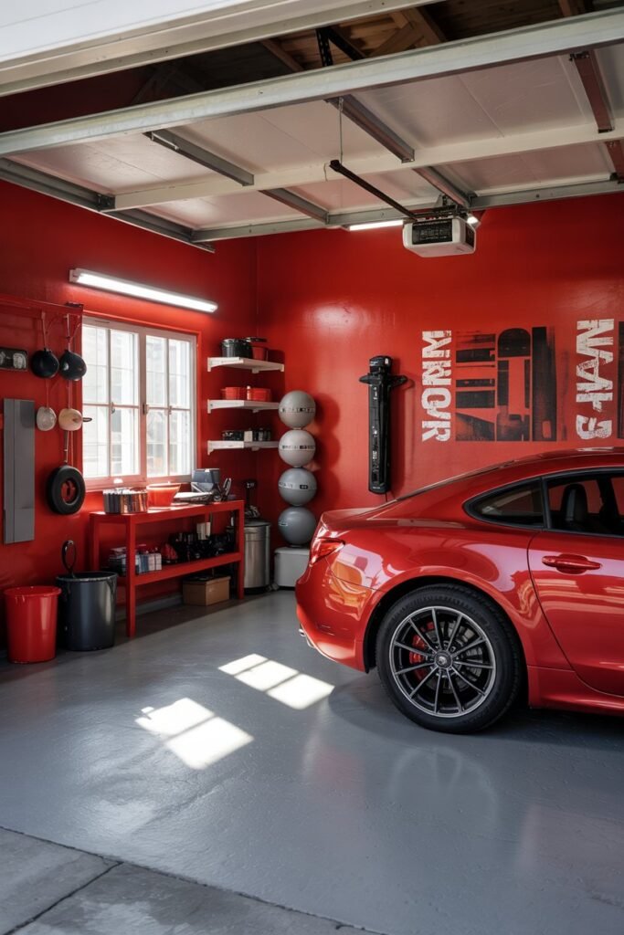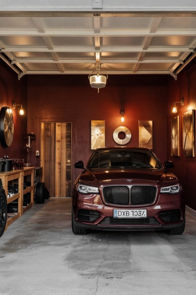 Deep burgundy walls bring a luxurious, elegant feel to your garage. This rich color pairs well with gold or brass accents, creating a sophisticated atmosphere.