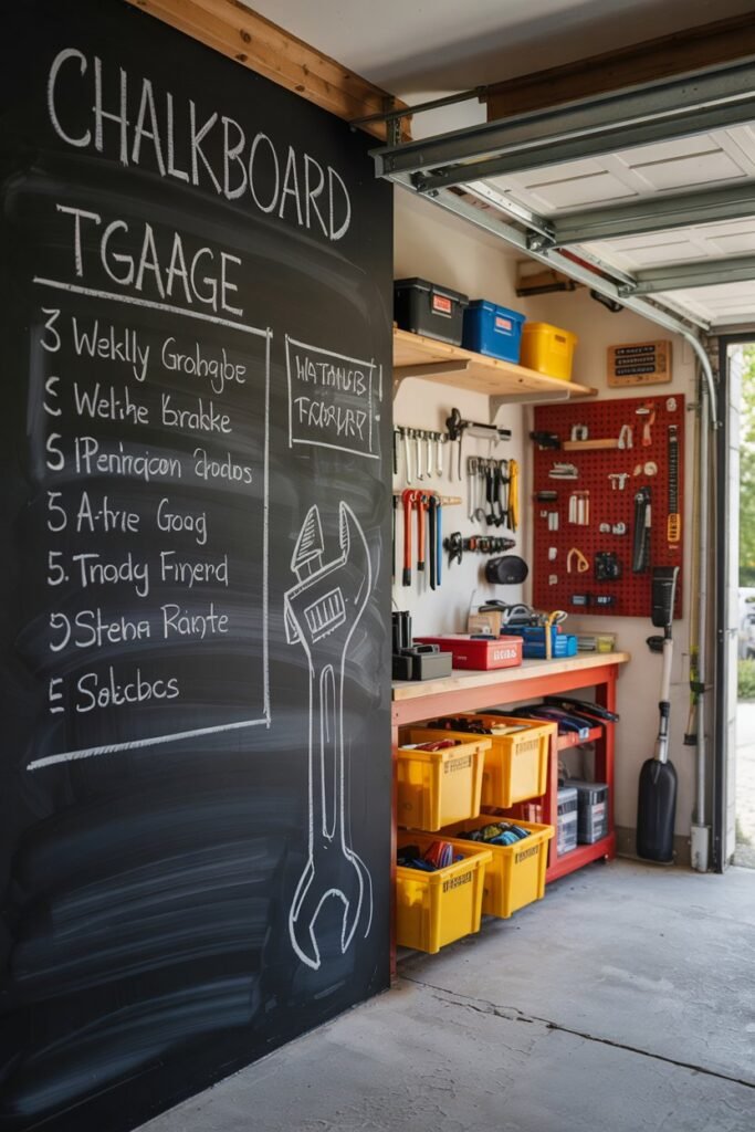 Chalkboard black paint turns your garage walls into a functional canvas for notes, sketches, or schedules.