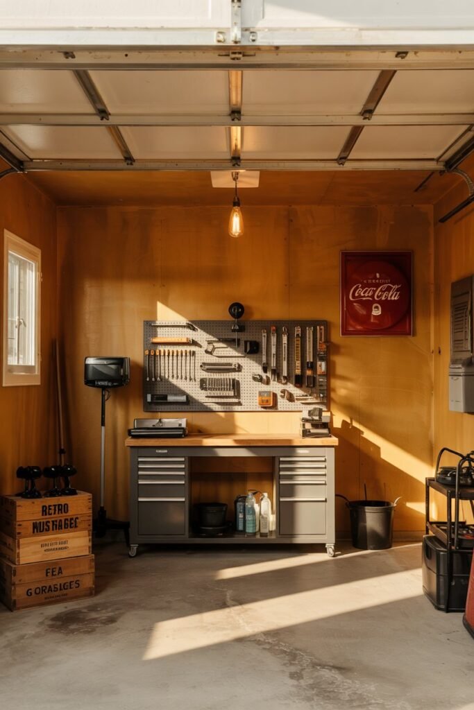 Add modern lighting or shelving for contrast. This idea is perfect for workshops or car garages, blending rugged style with functionality.