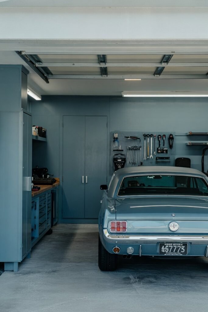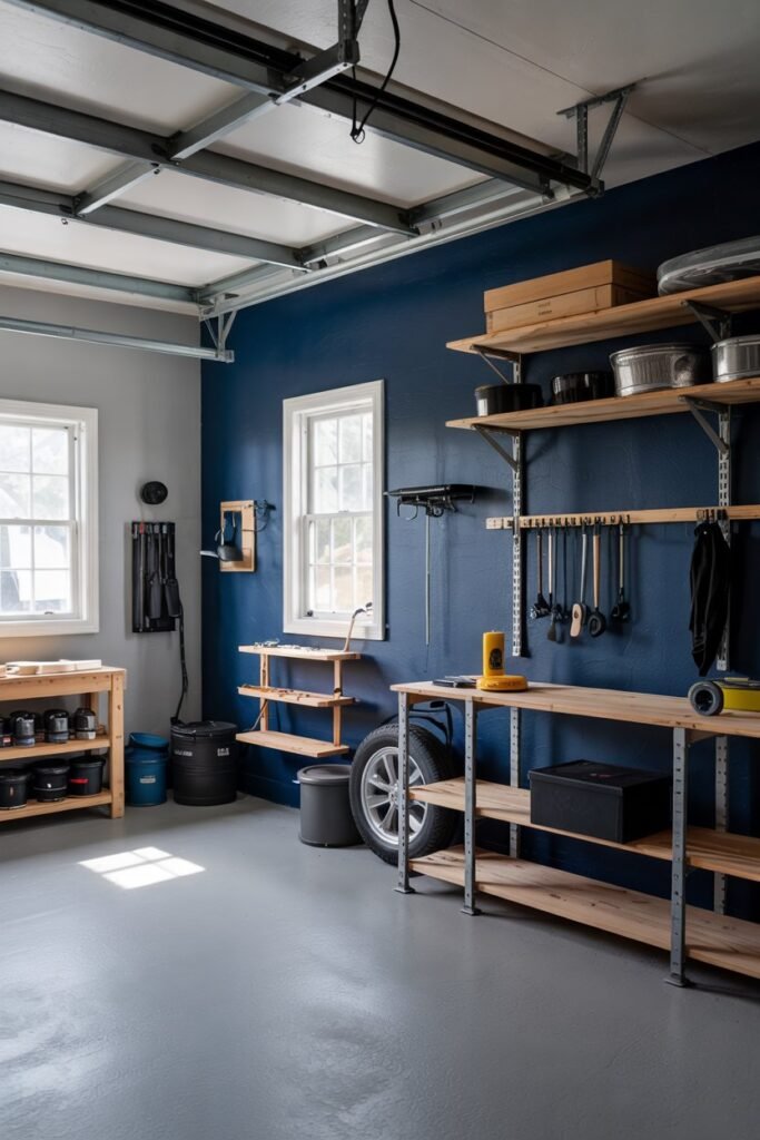 A navy blue accent wall adds sophistication and depth to your garage. This rich hue contrasts beautifully with white or light gray walls, creating a striking focal point.