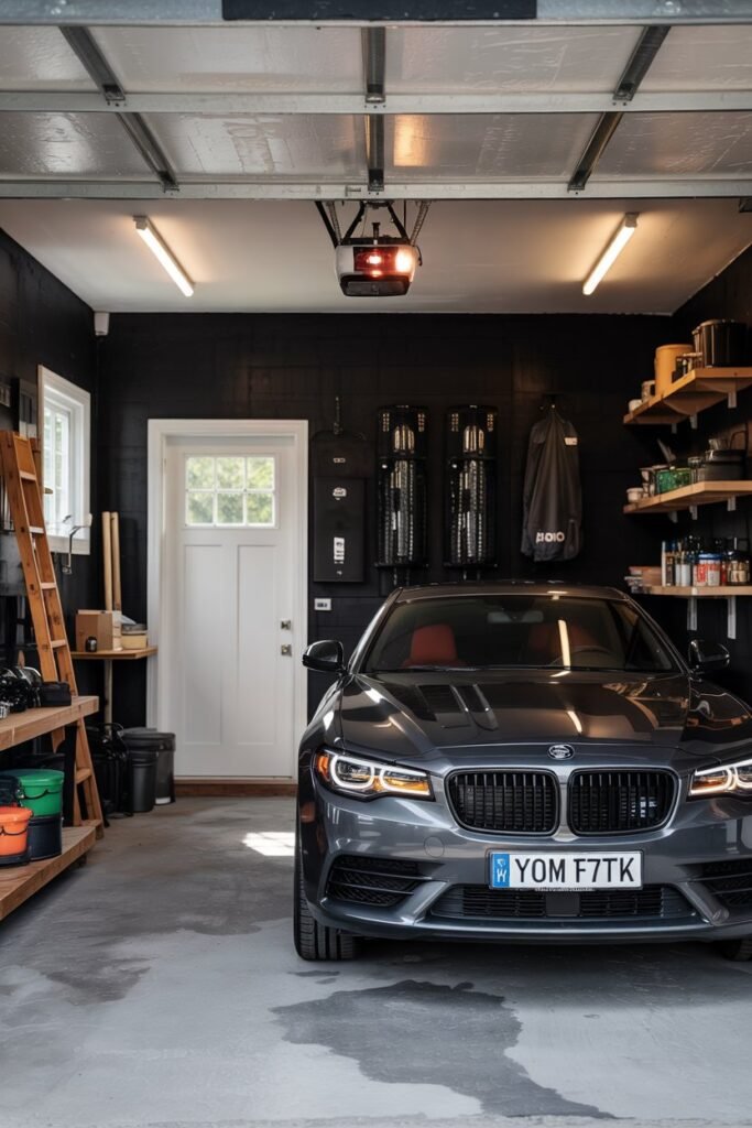 Incorporate wood or silver accents to soften the boldness. This idea works well for garages doubling as workshops or gyms, adding a touch of elegance to functional spaces.