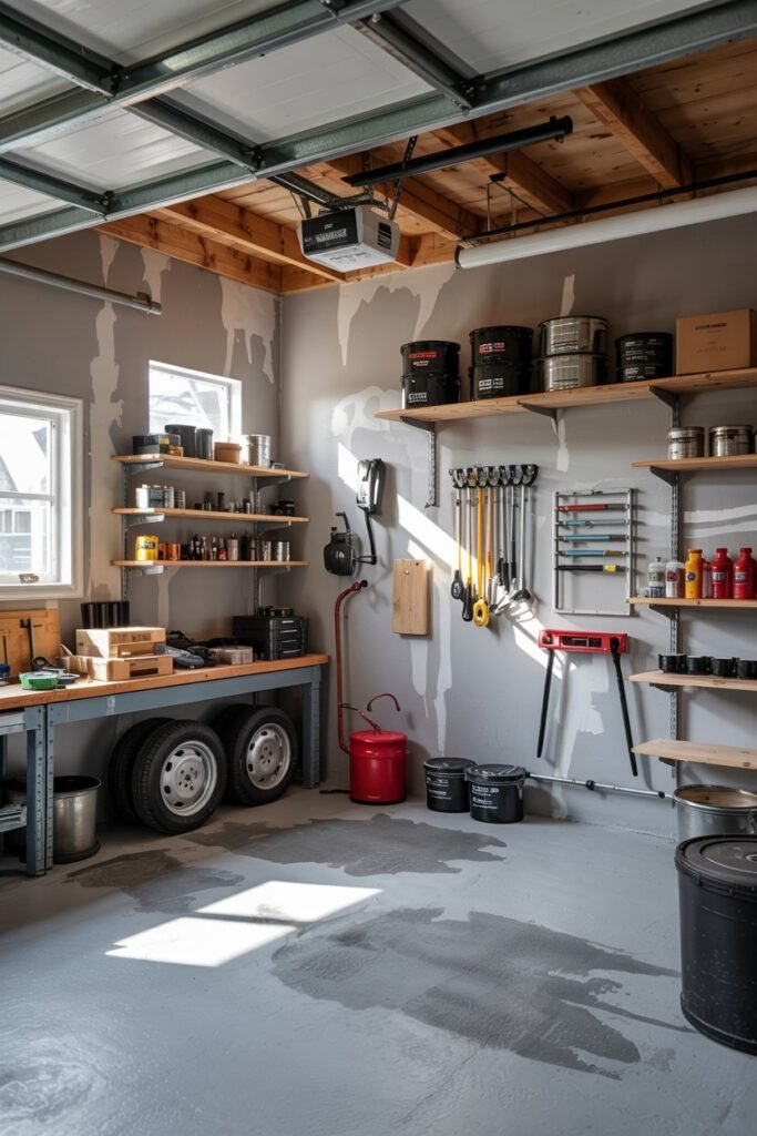 Add pops of color through tools or decor to keep the space lively. This idea suits workshops or garages aiming for a utilitarian, no-nonsense aesthetic.