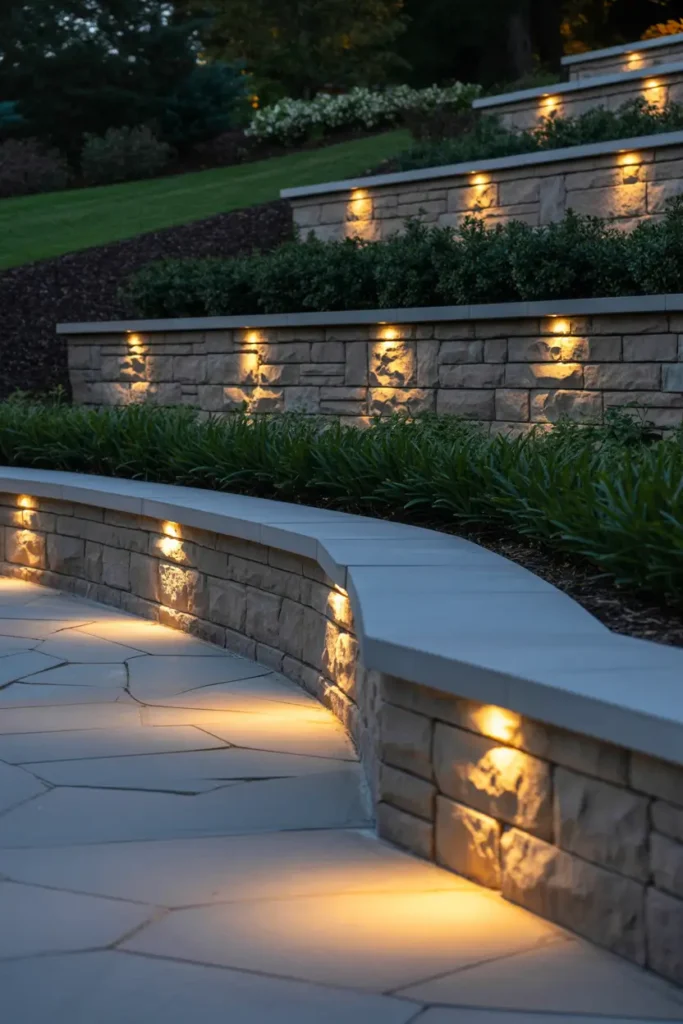 Built-in can lighting in garden retaining walls creates a polished, finished look. I’ve seen how these vertical lights provide practical illumination for walkways while serving as a design element.