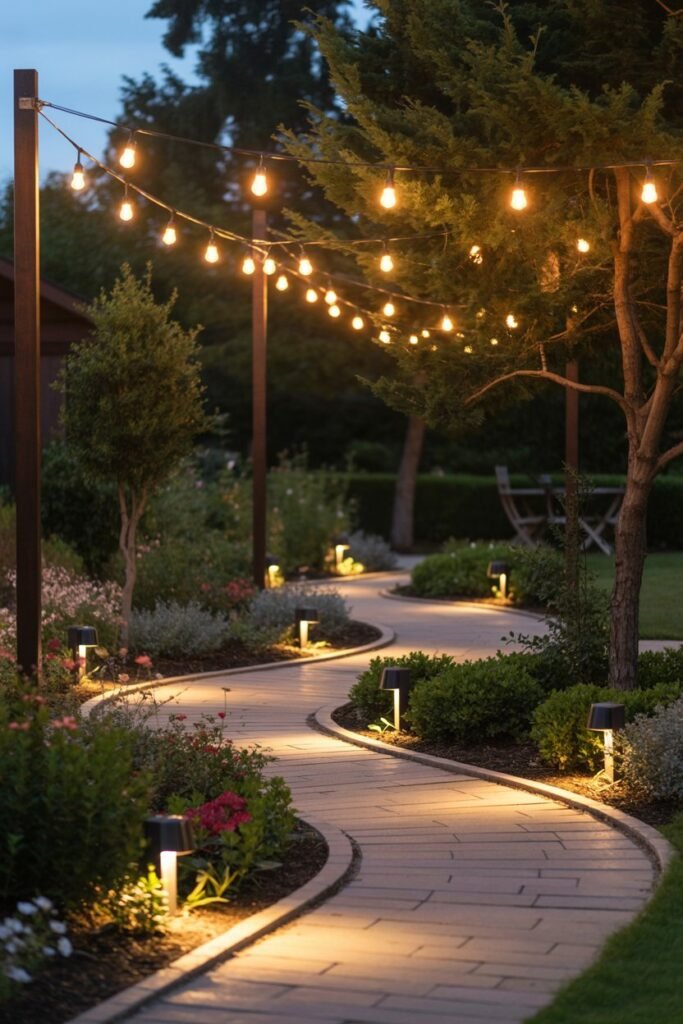 Curved pathways around your yard’s periphery benefit from a combination of ground-level uplights and overhead bulb string lights. I’ve found this dual approach ensures usability while creating atmosphere.