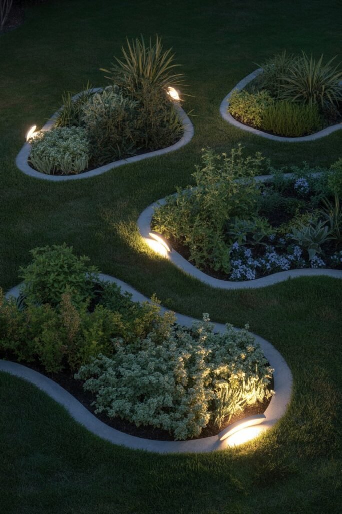 Thoughtfully installed LED lighting turns organically shaped garden beds into focal points. I recommend using plants at staggered heights to create dynamic displays that look even more impressive when lit.