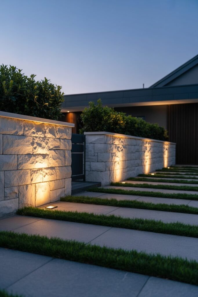 Soften modern landscaping with strategic outdoor lighting. I’ve seen uplighting on stone retaining walls work beautifully with embedded lights in driveways featuring green grass and large pavers.