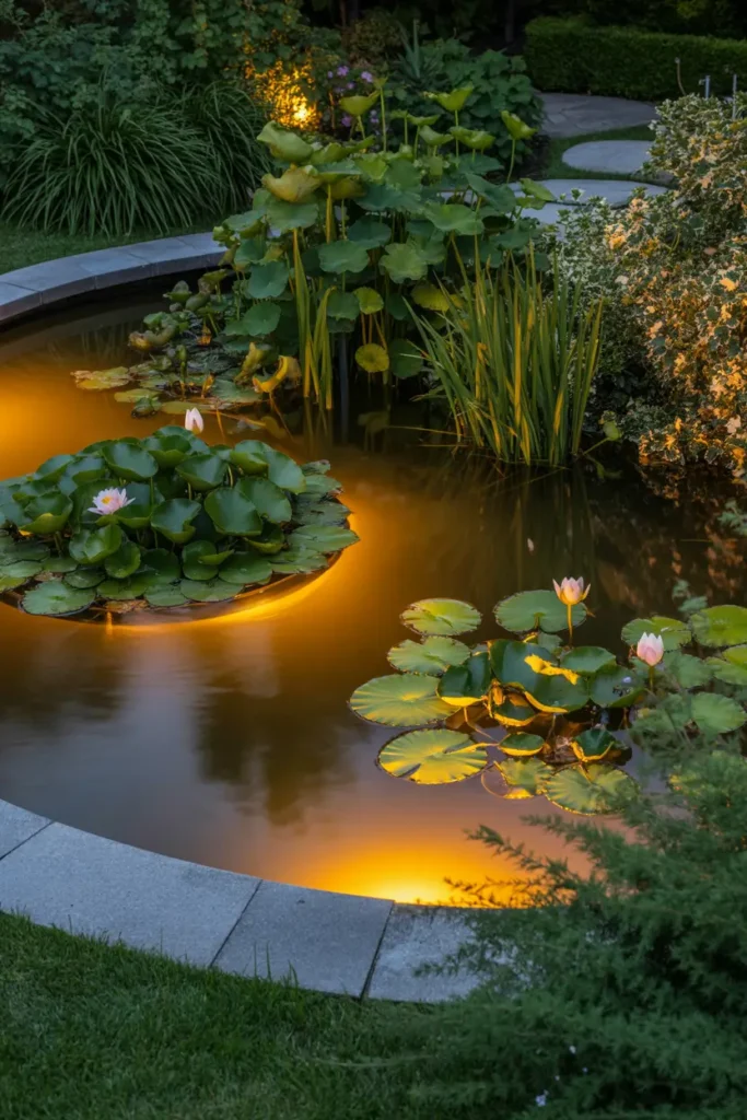Water features like garden ponds become magical when lit from within. I love how underwater lighting creates a golden glow that highlights water plants and adds tranquility.