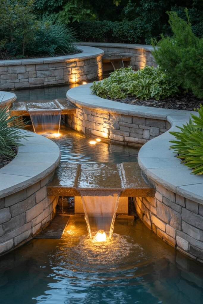 Stone retaining walls with built-in lighting around small water fountains create magical nighttime scenes. I’ve found this approach works well in compact spaces where you want maximum impact.