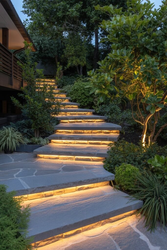 Safety meets style when you add integrated LED lighting to your garden steps. I’ve seen how these lights transform a simple staircase between a deck and garden into a sophisticated design feature.