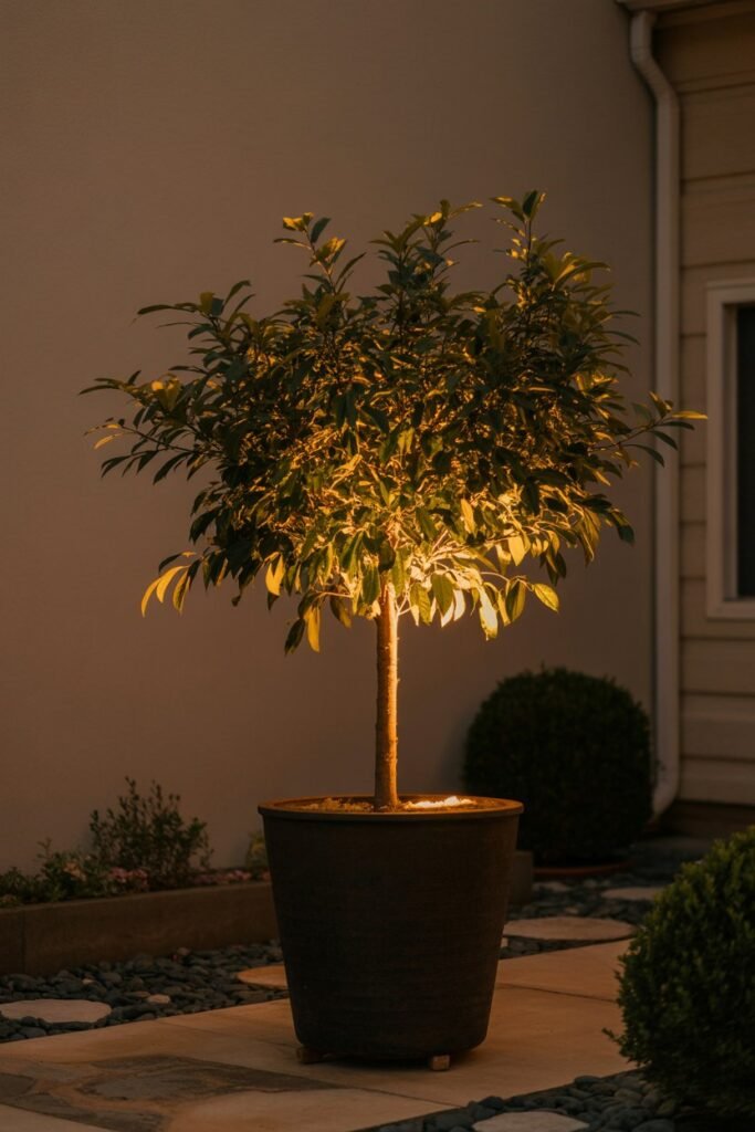 A single potted tree with backlighting can serve as a focal point in small backyard gardens. I love how this simple technique provides soft, warm illumination while highlighting foliage.