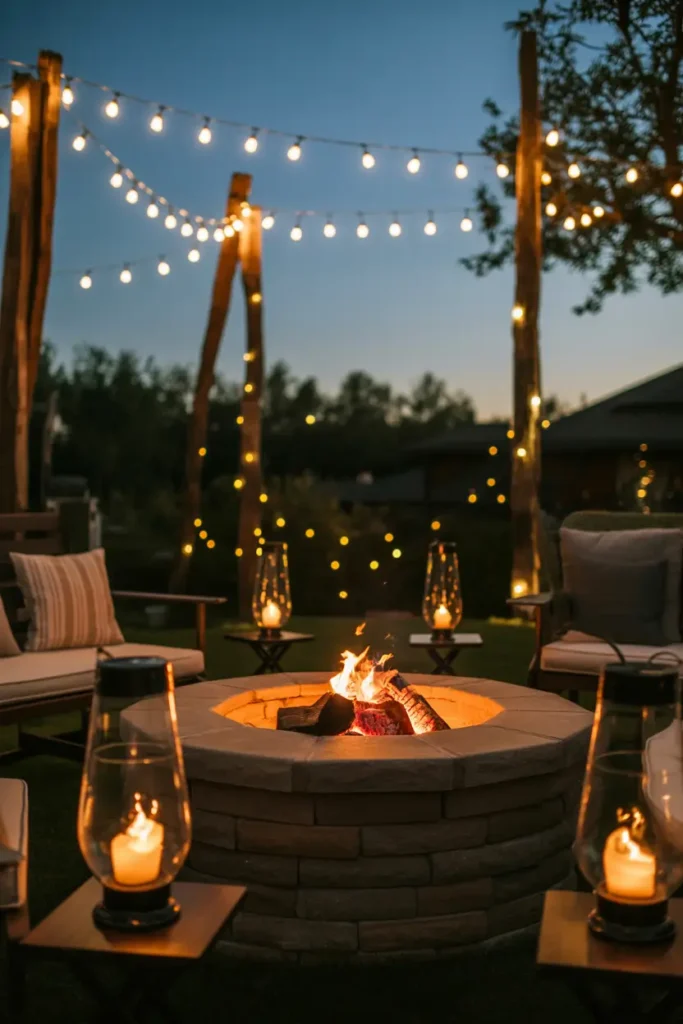 Fire pit areas deserve special attention when it comes to lighting. I suggest suspending string lights overhead and placing hurricane lanterns with candles at ground level for a rustic, layered look.