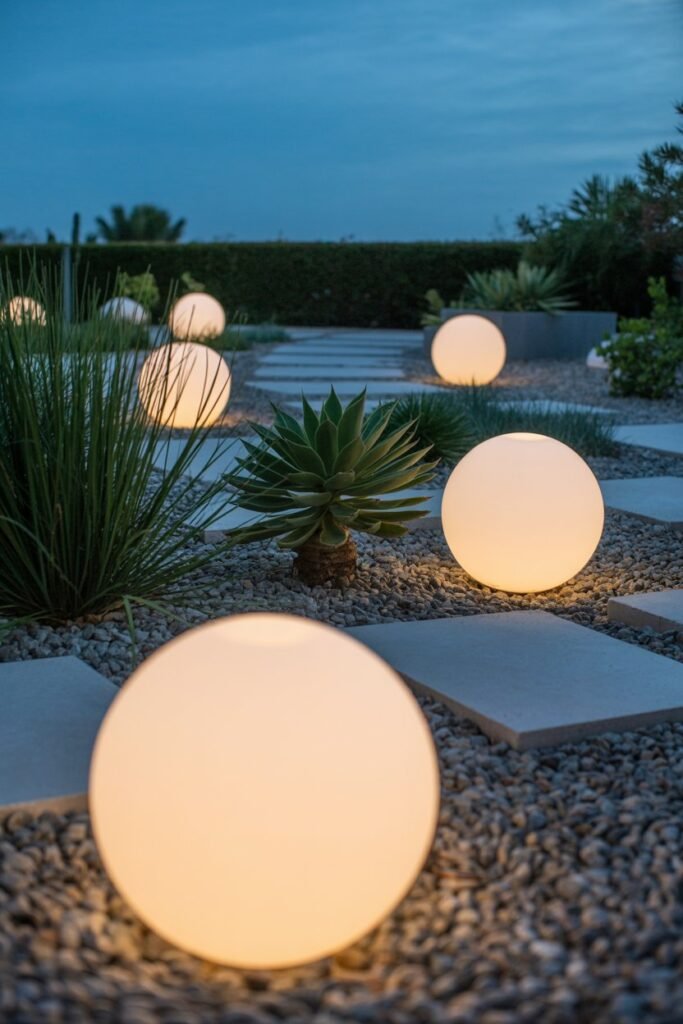 Globe lights give off an organic, moon-like glow that complements contemporary garden design. I prefer LED or solar-powered options because they’re energy-efficient and easy to install.