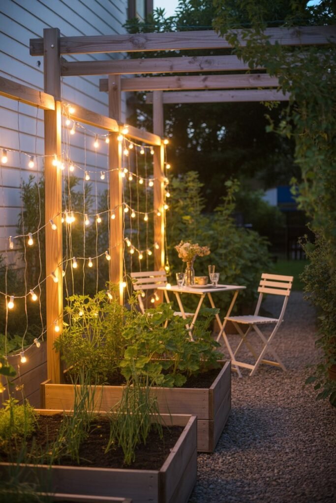 String lights suspended from a garden trellis or arbor transform raised bed areas into enchanting spaces. I love setting up a small table and chairs nearby to create an intimate spot for morning coffee or evening relaxation.