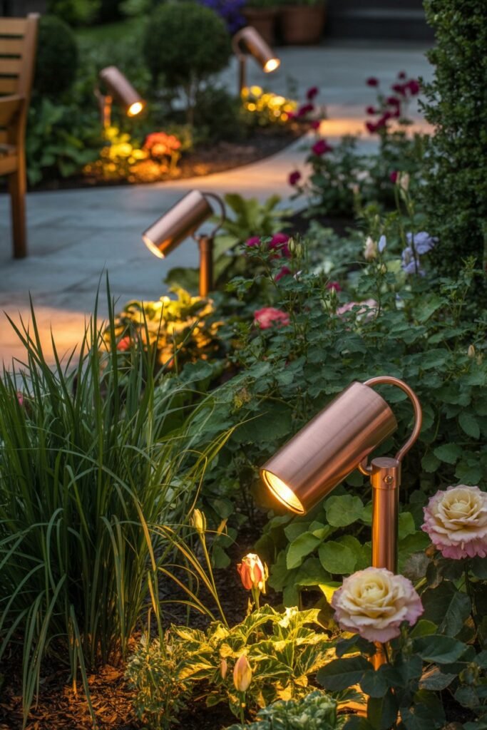 Copper spotlights offer a warm, sophisticated upgrade to standard garden fixtures. I appreciate how these metal lights glimmer in sunlight during the day and provide beautiful illumination at night.