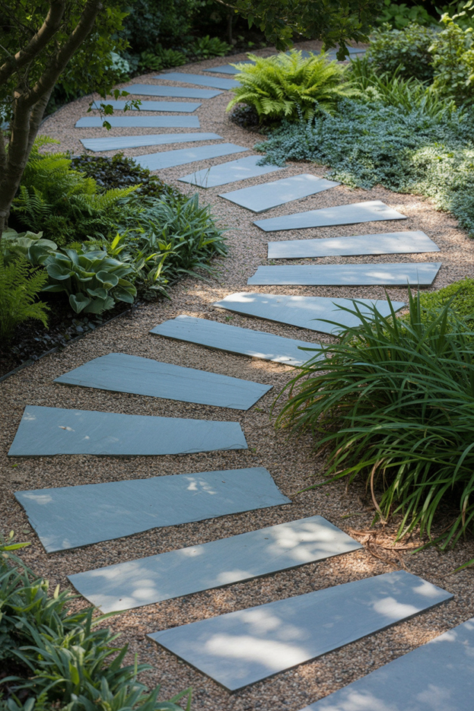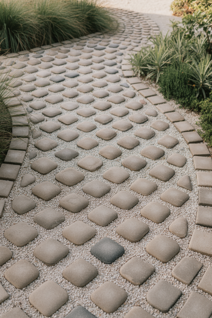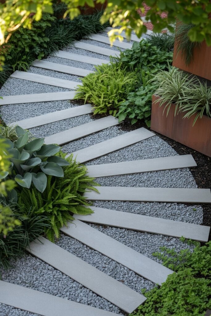 I love how a staggered, geometric gravel walkway creates visual interest while remaining functional. By combining gravel with strategically placed pavers, you create nooks and crevices that give your pathway dimension and character.
