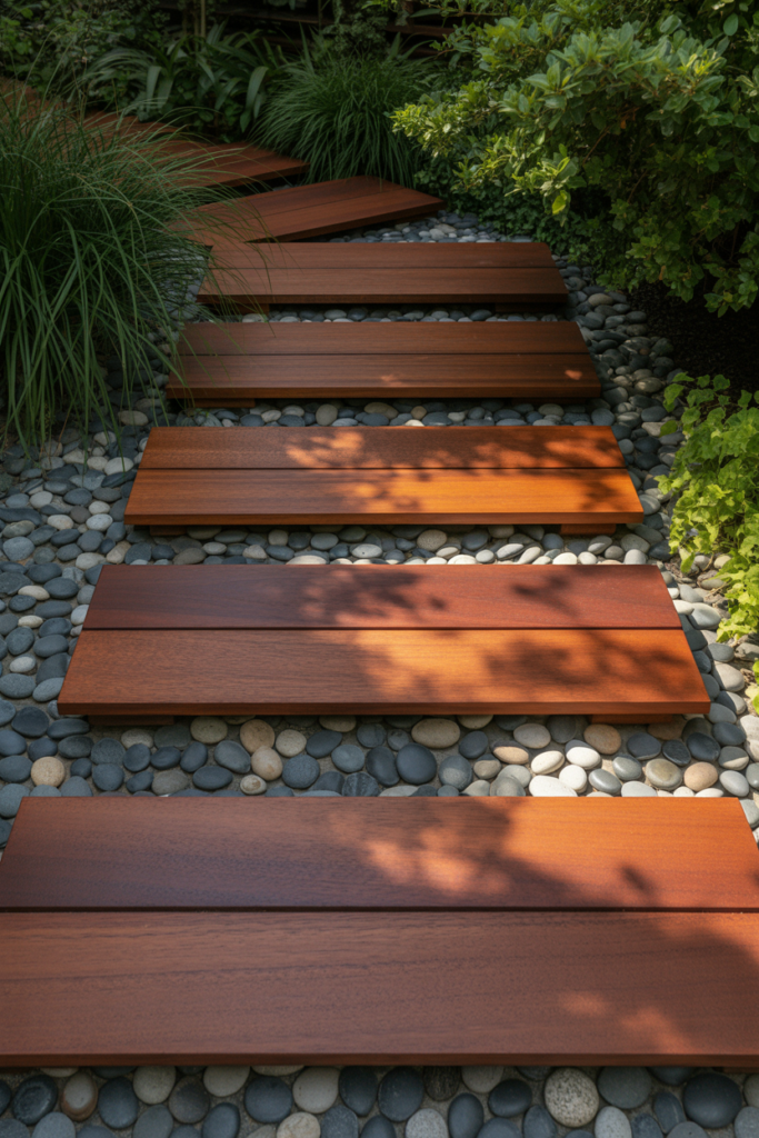 I’m always impressed by the warmth that wood brings to outdoor spaces. A jarrah timber walkway laid over natural river stones creates a beautiful contrast of textures and colors.