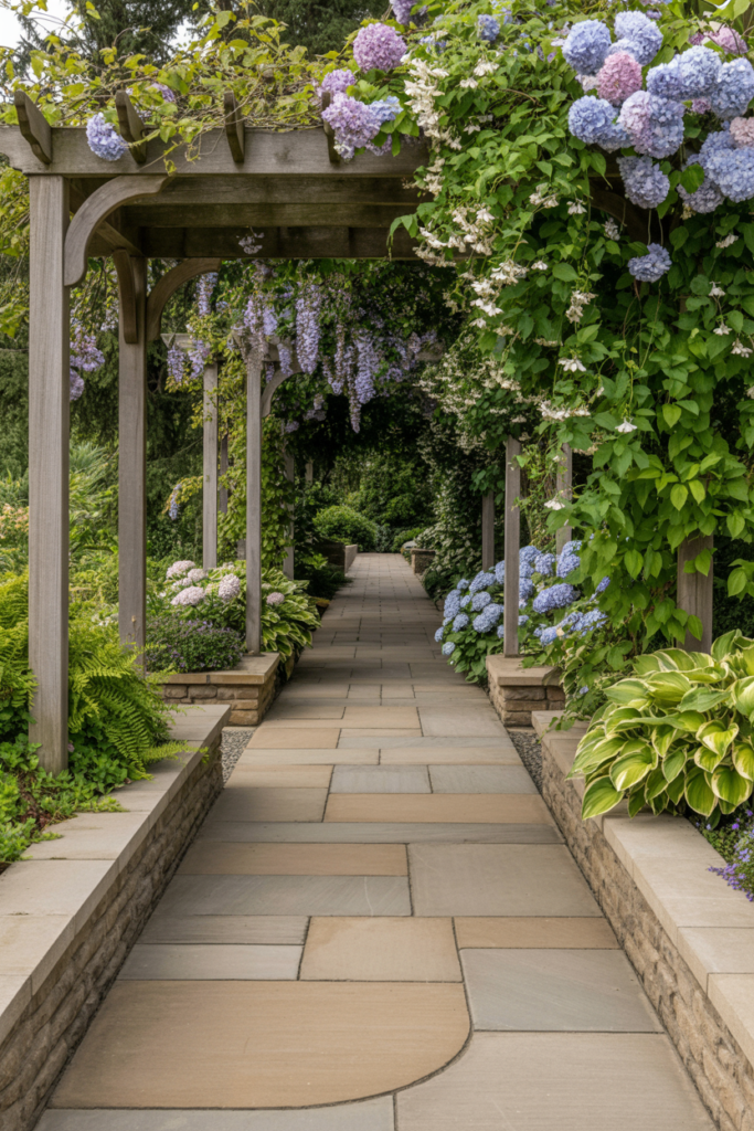 The permanence of cemented flagstone provides structure, while the flowering vines soften the look and add seasonal interest. Surrounding the path with hydrangeas, hostas, and ferns creates layers of texture and color that make the journey through your garden truly special.