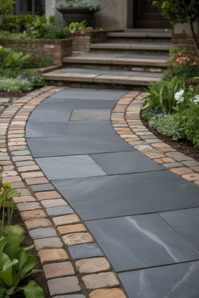 I love how cobblestone borders can tie a pathway into the overall architecture of a home. When your entrance features cobblestones, extending them to the stair risers and using them to outline slate-tile walkways creates a cohesive, intentional design.