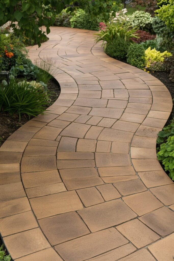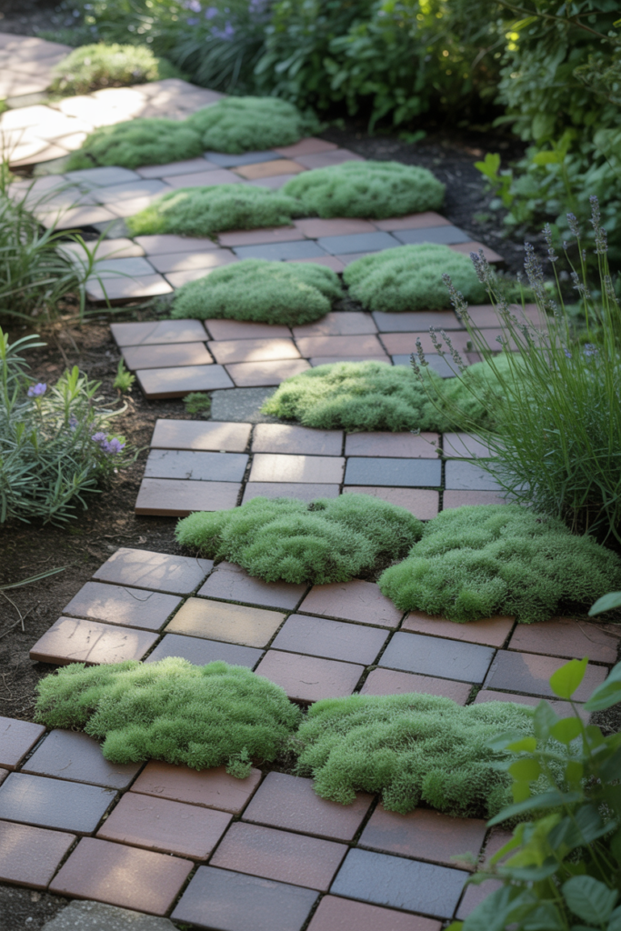 The key is in the layout and the plantings. The staggered pattern adds visual interest, while the soft plants growing between and around the pavers create a romantic, cottage-garden feel. This proves that thoughtful design matters more than material cost.