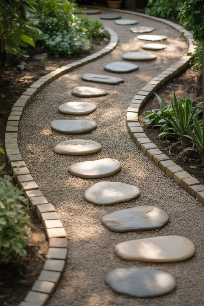 Stone edging keeps the gravel contained and provides clean lines. The random placement of stepping stones feels organic rather than forced, encouraging a slower, more mindful journey through your garden.