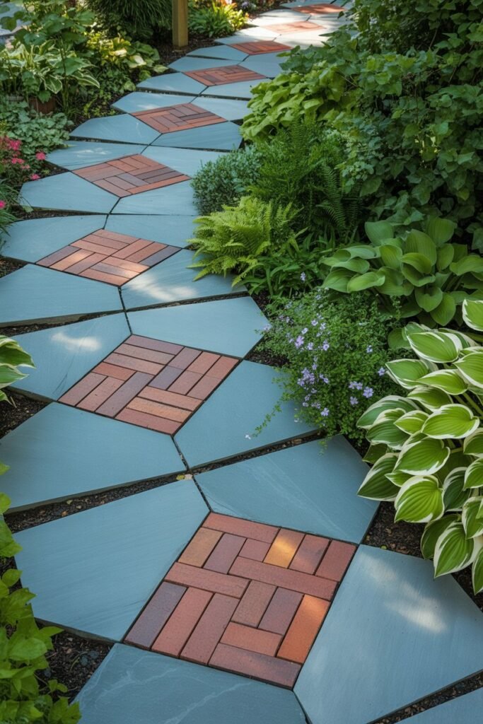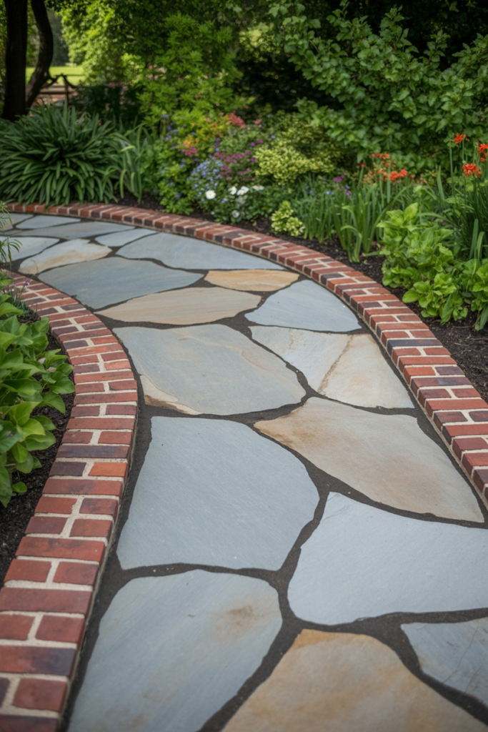 The flagstone’s organic shapes give your pathway character, while the brick border provides structure and keeps everything in place. This design is surprisingly easy to maintain, and the natural color variations in both materials ensure your path looks beautiful year after year.