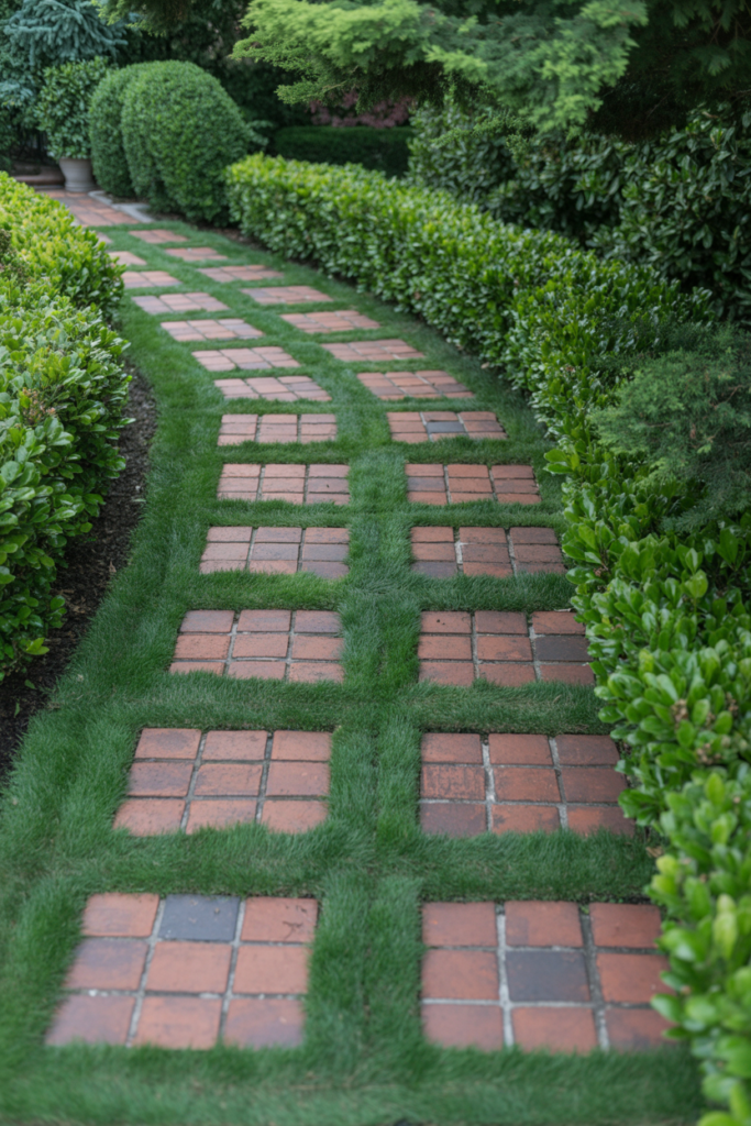 The boxwood provides year-round greenery and structure, while the open squares of lawn or ground cover between the bricks keep the look from feeling too rigid. This design works particularly well for side yards where you want to create interest in a narrow space.