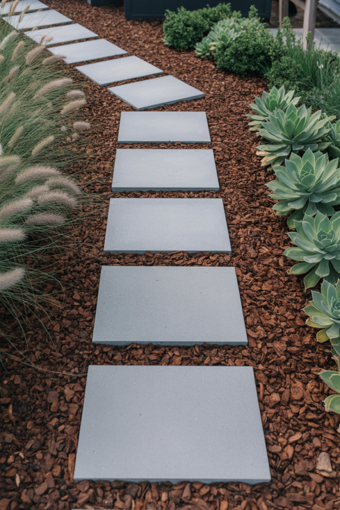When I want to create a modern, clean-lined pathway, I turn to square stepping-stones nestled in mulch. This combination offers a sleek aesthetic that works beautifully with contemporary landscaping.
