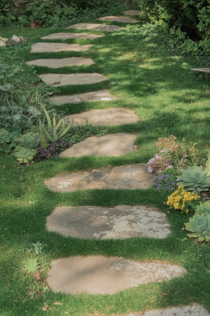 The grass fills in naturally over time, and you can enhance the look by adding low-growing plants like succulents in strategic spots. This design works particularly well in informal garden settings where you want the pathway to blend seamlessly with the surrounding landscape rather than stand out as a separate feature.