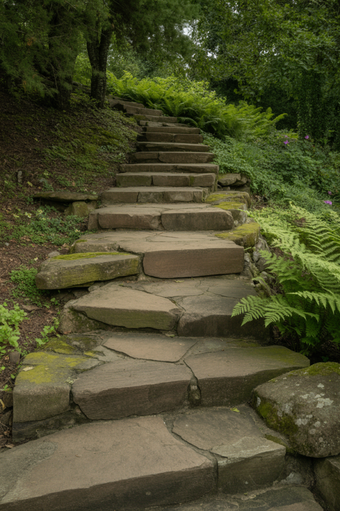 When I’m working with sloped terrain, I turn to large unhewn stones for both pathways and stairs. These create a natural, forest-like setting that feels like it’s always been part of the landscape.