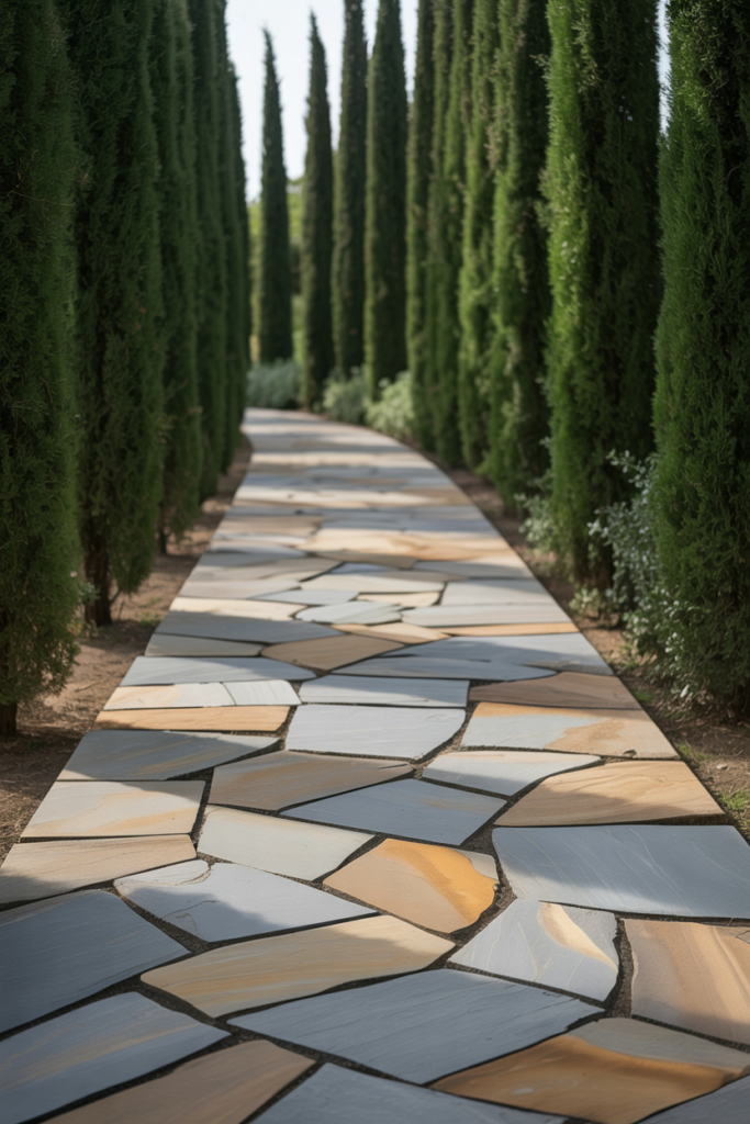 The staggered stonework pattern is key here—it keeps narrow pathways from feeling cramped or claustrophobic. The vertical lines of the cypress trees draw the eye upward and make the space feel larger, while the irregular flagstone pattern adds visual interest at ground level.