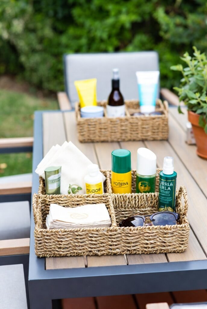 For tabletop clutter, I rely on weather-resistant wicker baskets. They are perfect for corralling small, loose items like sunscreen, bug spray, napkins, and sunglasses.