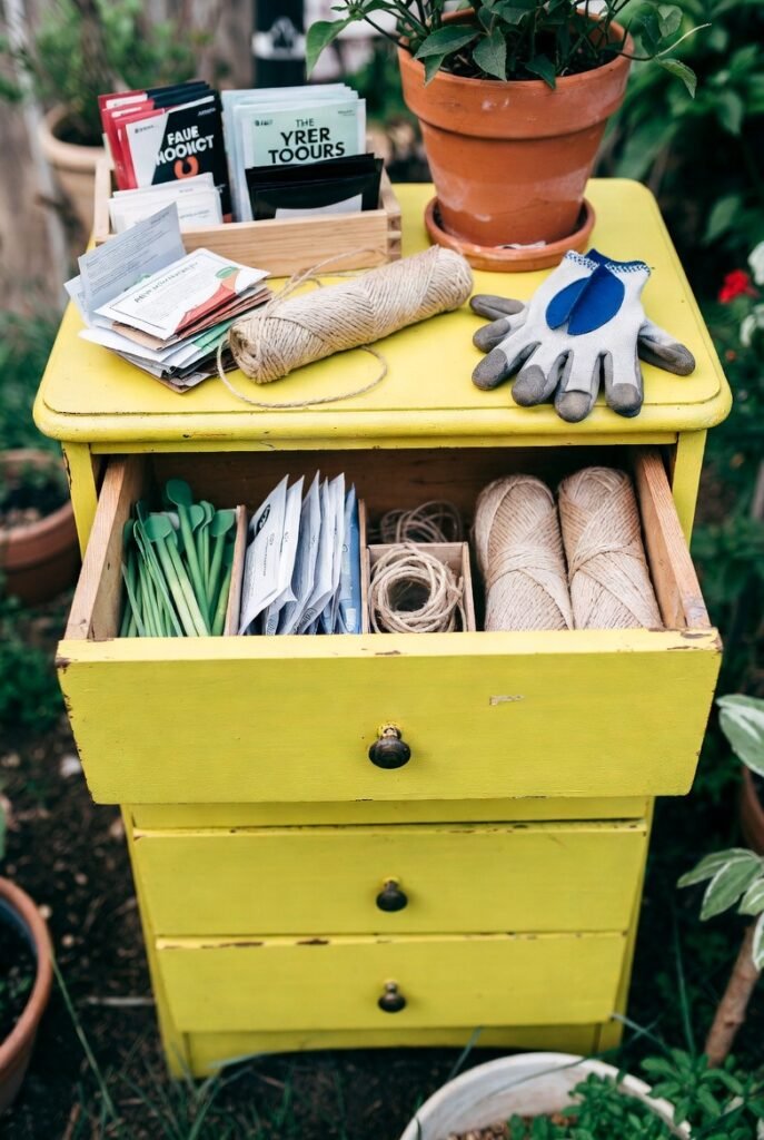 Similar to the bookshelf idea, an old dresser can become a fantastic garden storage unit. I love using the drawers to organize seed packets, twine, plant markers, and gloves.