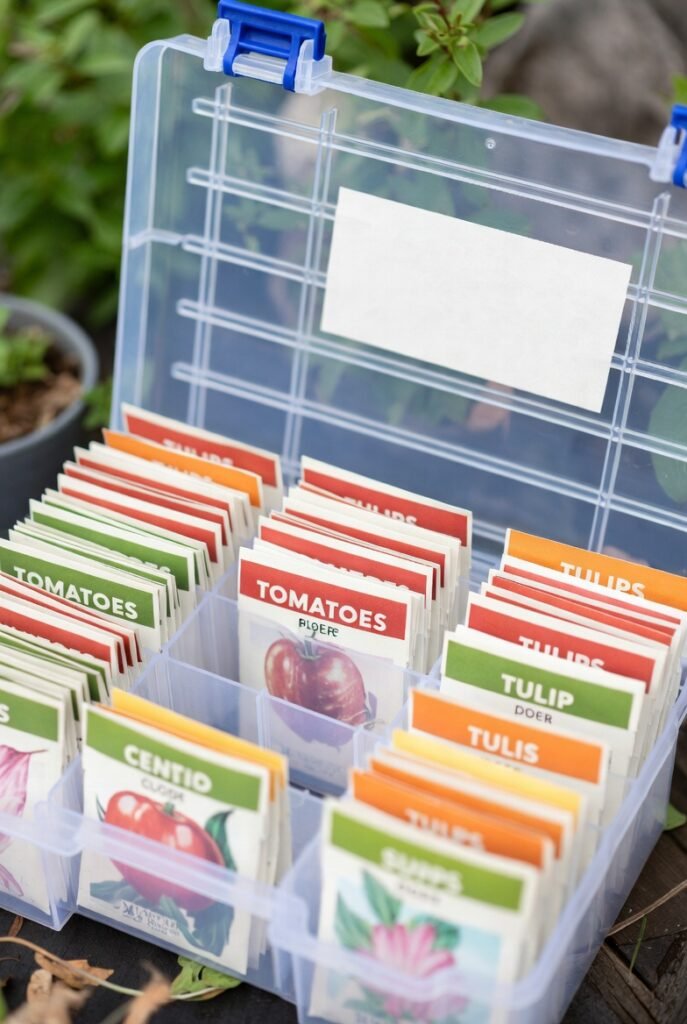 Keeping seed packets organized can be a nightmare. I have found that a simple plastic tackle box or a photo storage case is the perfect solution for this.
