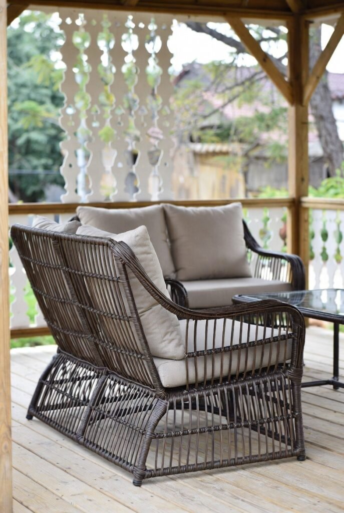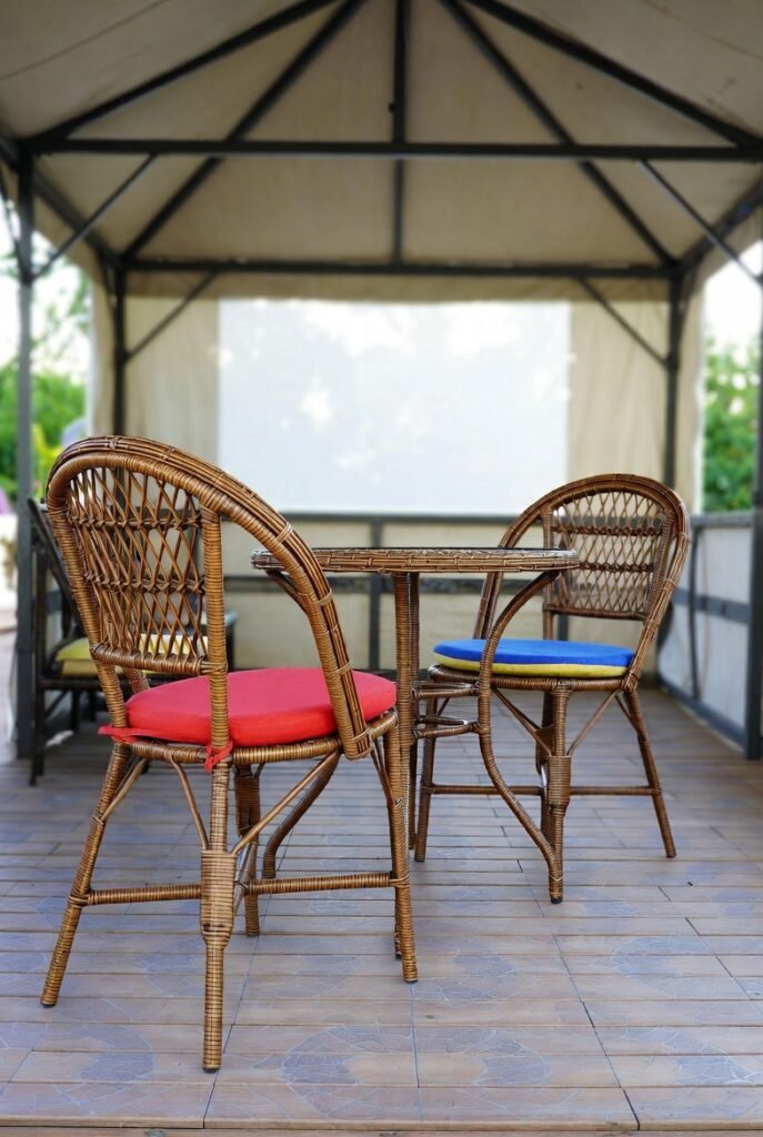 For smaller gazebos, I adore a classic wicker bistro set. It consists of two chairs and a small table, creating an intimate setting. This setup reminds me of charming Parisian cafes and requires very little floor space.