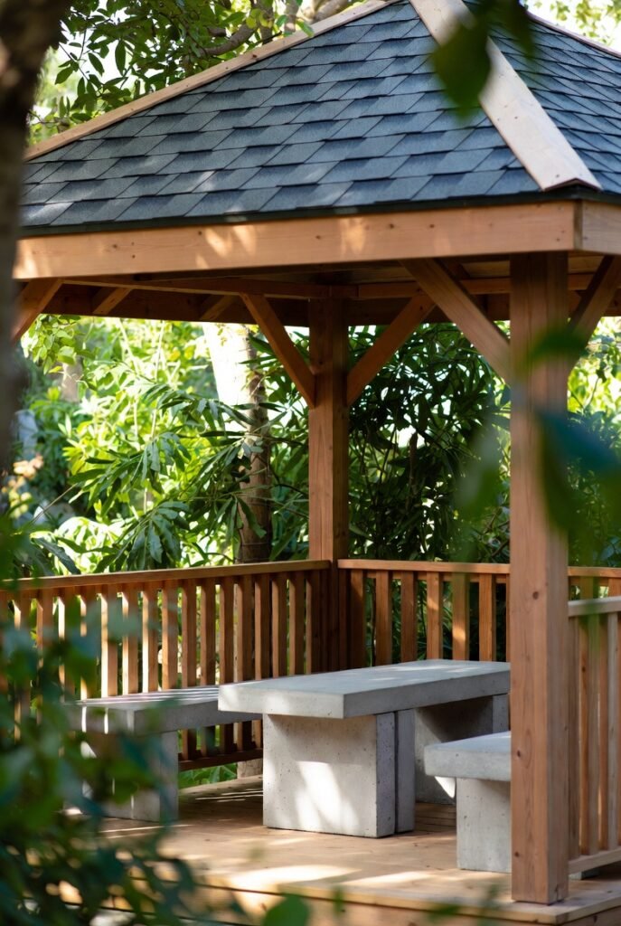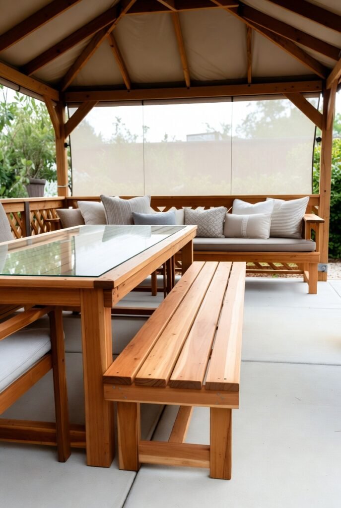 You can also place a bench against the gazebo wall with some throw pillows. This creates a quiet observation spot. I recommend adding a long seat cushion to ensure comfort during long conversations.