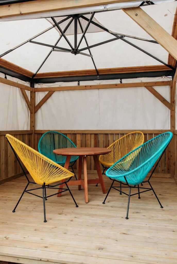 I love mixing materials, and metal stools add a great industrial edge to a wooden gazebo. They are durable, stackable, and easy to clean. If you have a built-in bar ledge in your gazebo, these are the perfect seating solution.