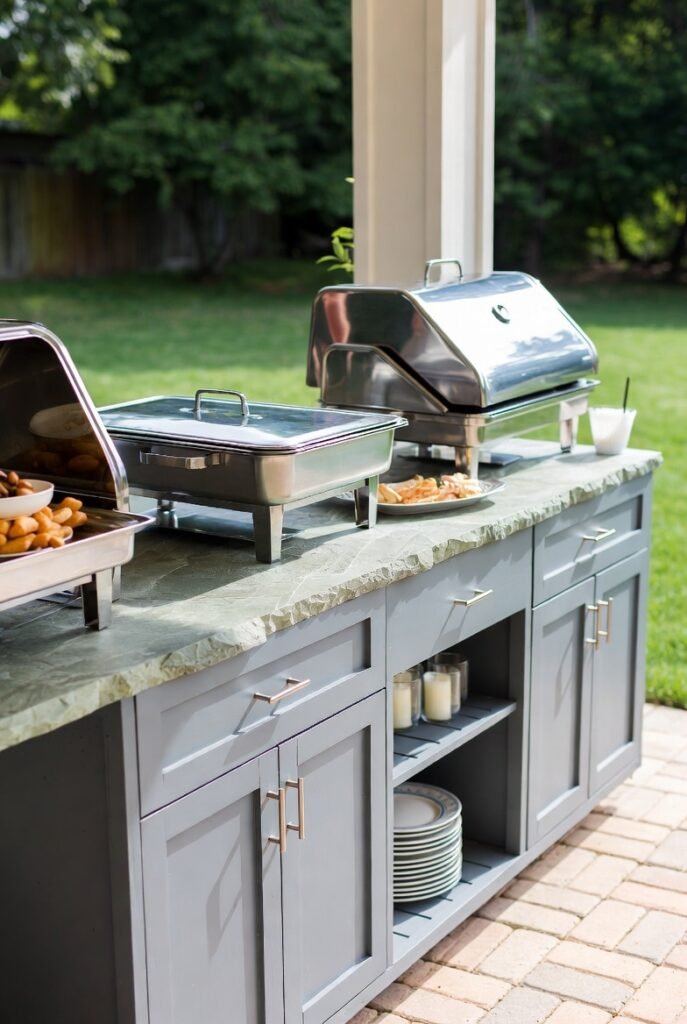 Look for a buffet with a stone or metal top. These materials can handle hot serving dishes better than wood or plastic. I find this piece essential for anyone who hosts frequent barbecues or potlucks.
