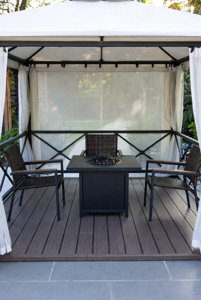 I think a fire pit table is a game-changer for extending your gazebo use into the cooler months. It serves as a coffee table during the day and a cozy heat source at night. This dual functionality makes it a smart investment for smaller spaces.